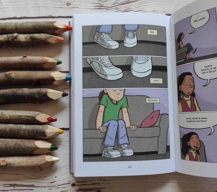 Recebi esse quadrinho como cortesia da editora Intrínseca e adorei a leitura! É leve, bem humorada e informa sobre ansiedade de uma forma fácil de compreender. Adorei o traço da autora e as cores utilizadas de acordo com as emoções!