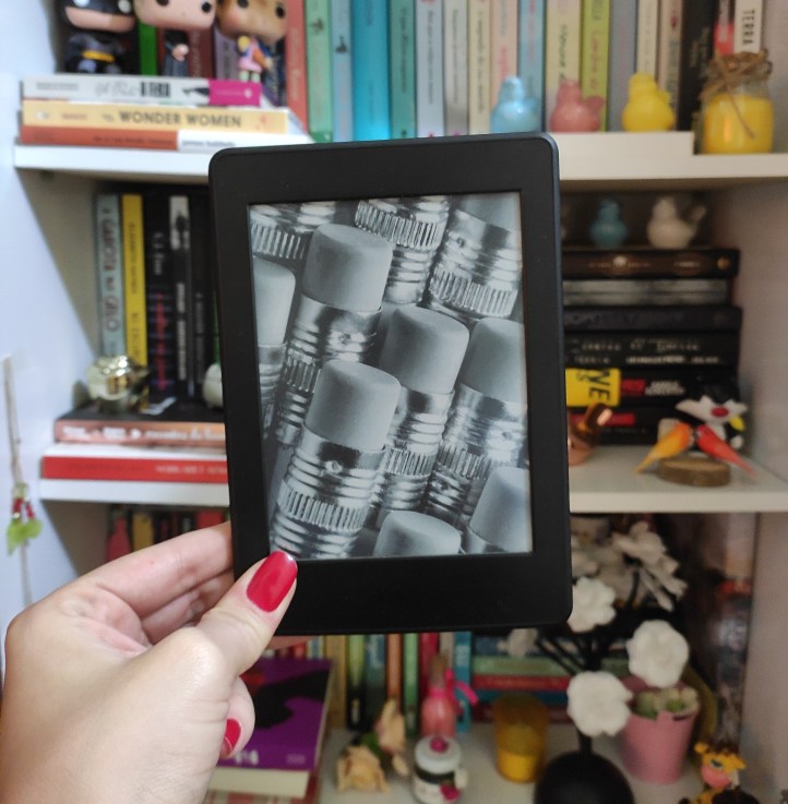 Depois que eu ganhei o meu Kindle, fico com preguiça de carregar livros físicos na bolsa no dia-a-dia, principalmente por causa do peso! O Kindle é levinho, cabe vários livros e é muito mais prático pra ler em filas ou no transporte público, pois dá pra segurar e “passar as páginas” com uma mão só!